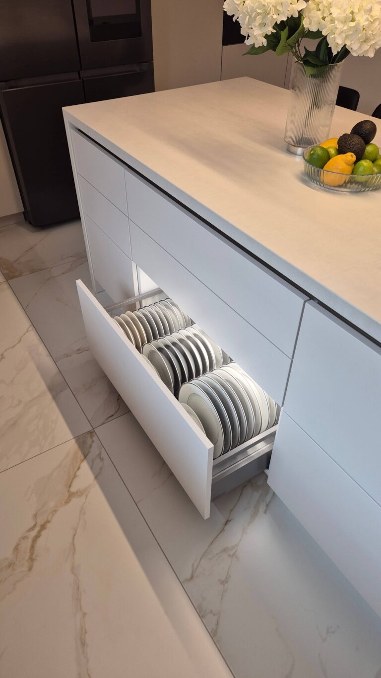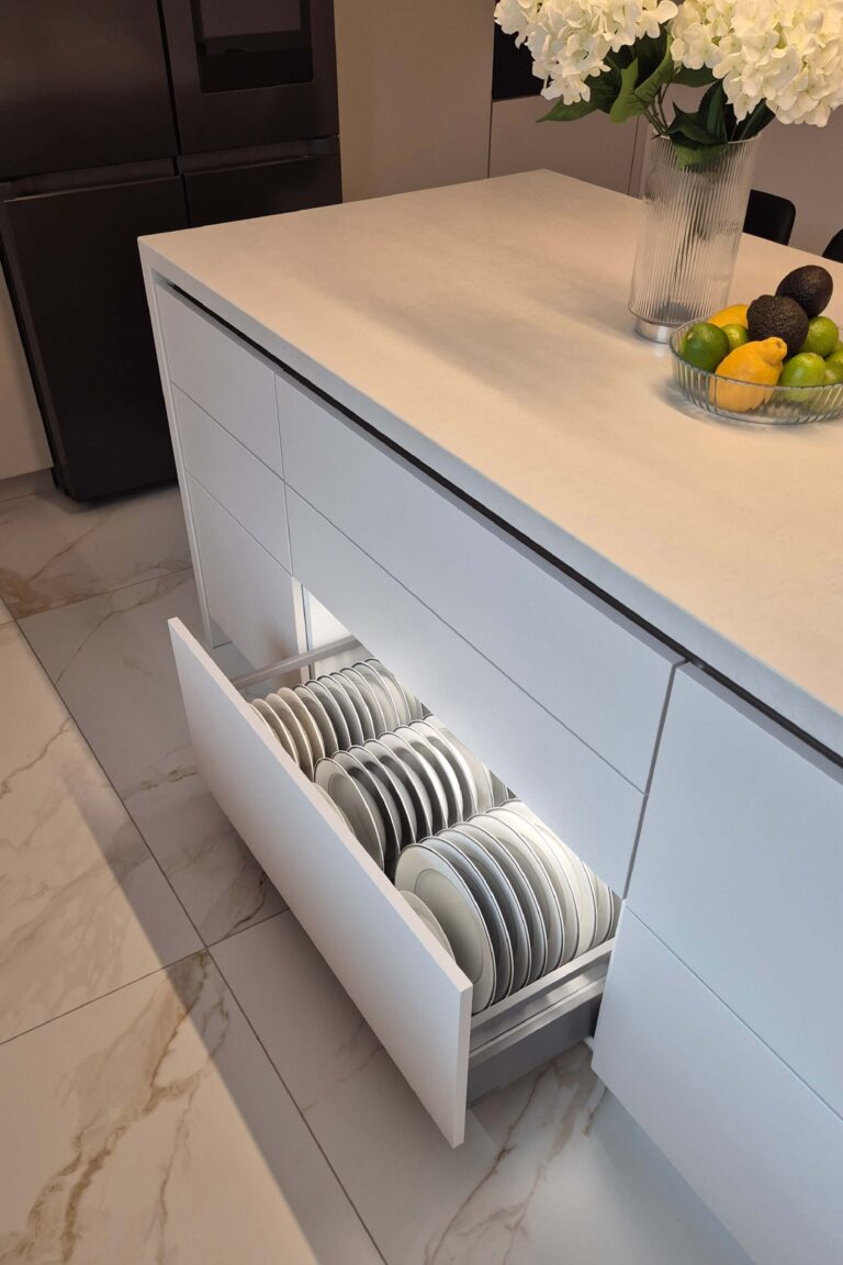 Dobrze zaprojektowane miejsce na talerze sprawia, że kuchnia pracuje szybciej i ciszej, a blaty pozostają wolne od zbędnych przedmiotów. W zabudowie na wymiar można dopasować