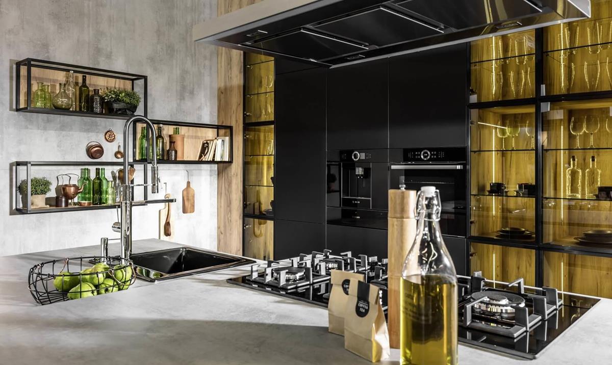 Ważnym aspektem tego projektu jest umiejętne połączenie funkcji użytkowych z estetyką, co sprawia, że kuchnia staje się sercem domu. Przemyślane rozmieszczenie sprzętów AGD, takich jak piekarnik, płyta gazowa czy zmywarka, pozwala na komfortowe przygotowywanie potraw, a nowoczesne rozwiązania technologiczne zostały harmonijnie wkomponowane w zabudowę, nie zakłócając minimalistycznej koncepcji. Szafy z frontami w kolorze głębokiej czerni oraz przeszklone witryny z żółtym podświetleniem stanowią ciekawy kontrapunkt do jasnych i naturalnych elementów drewna.