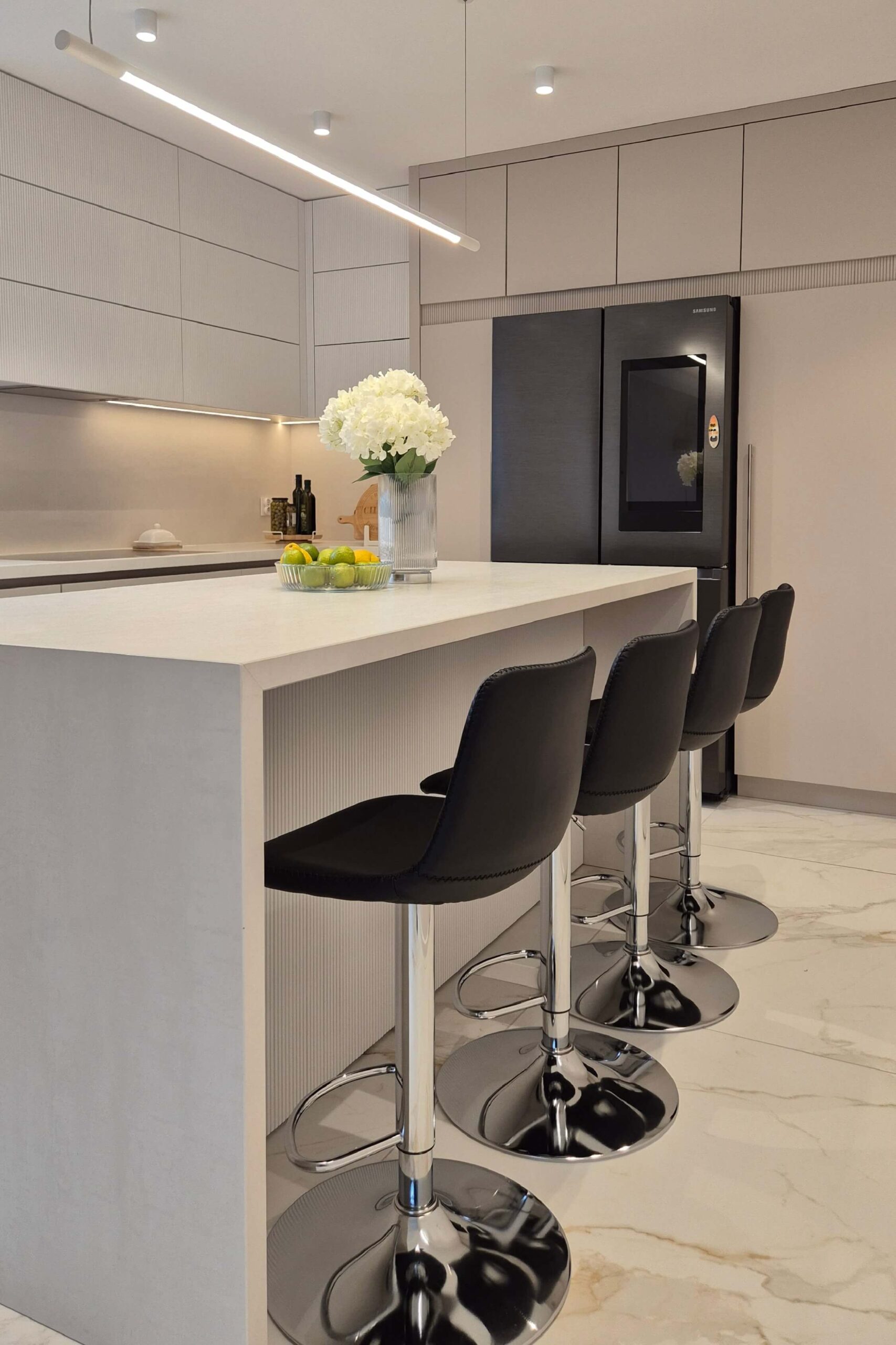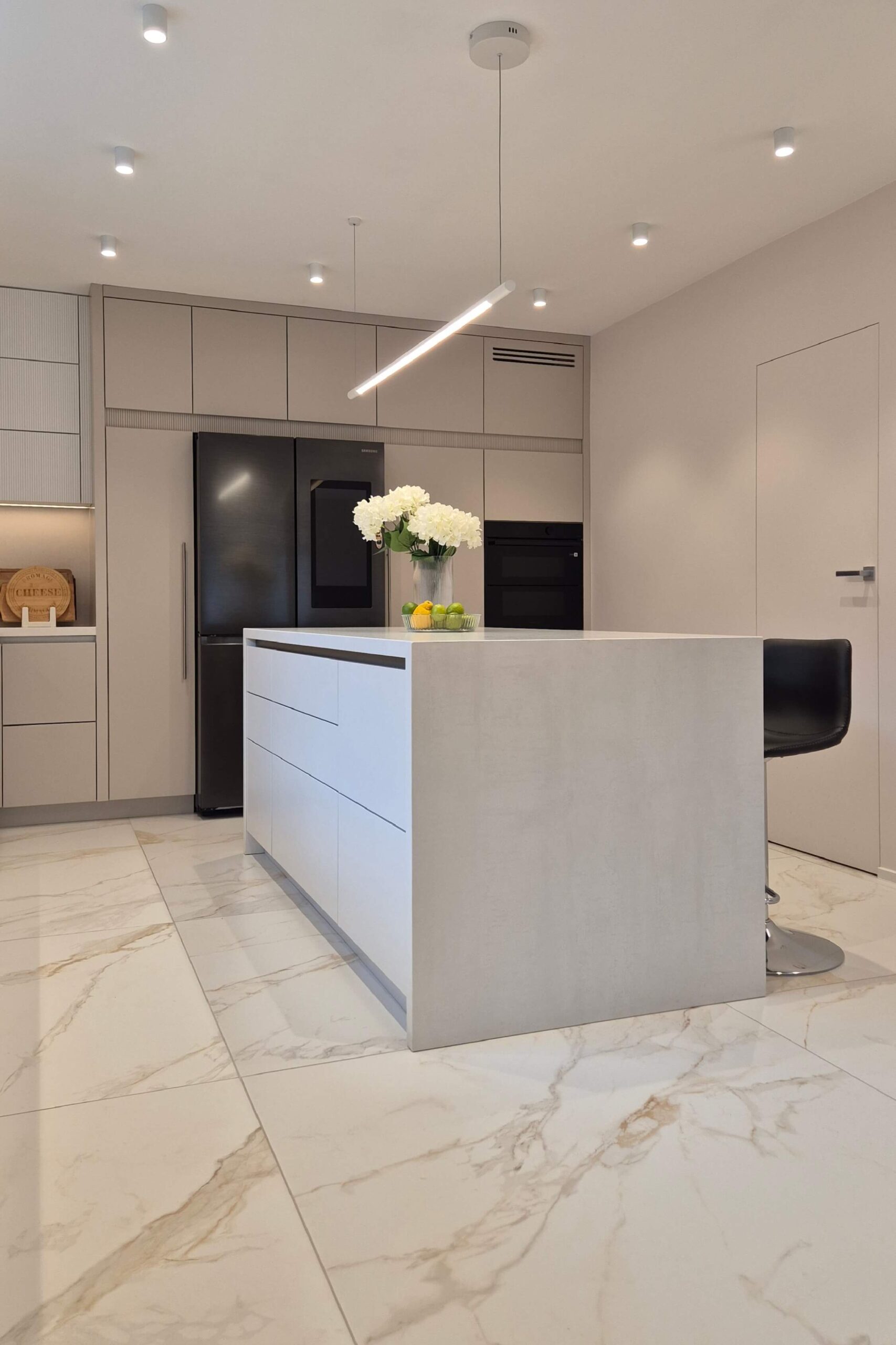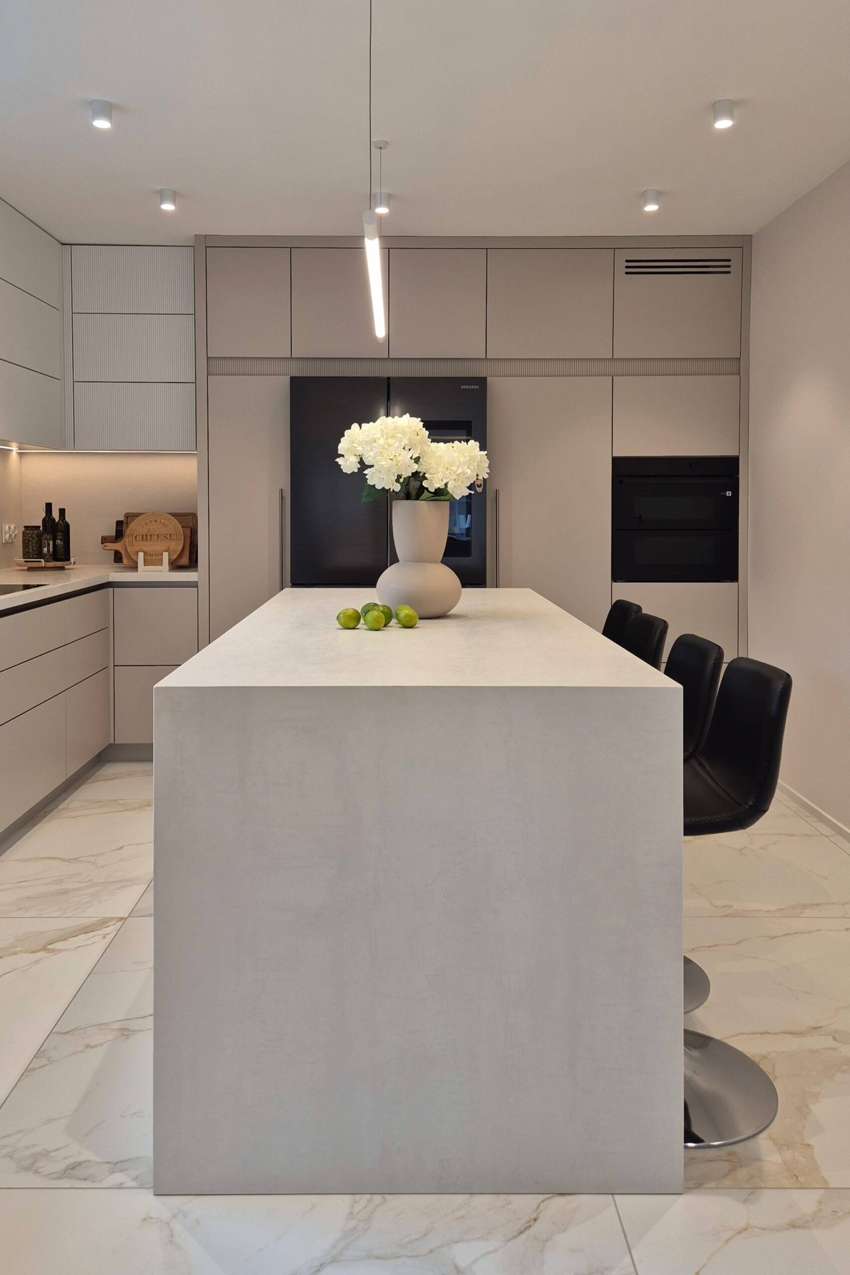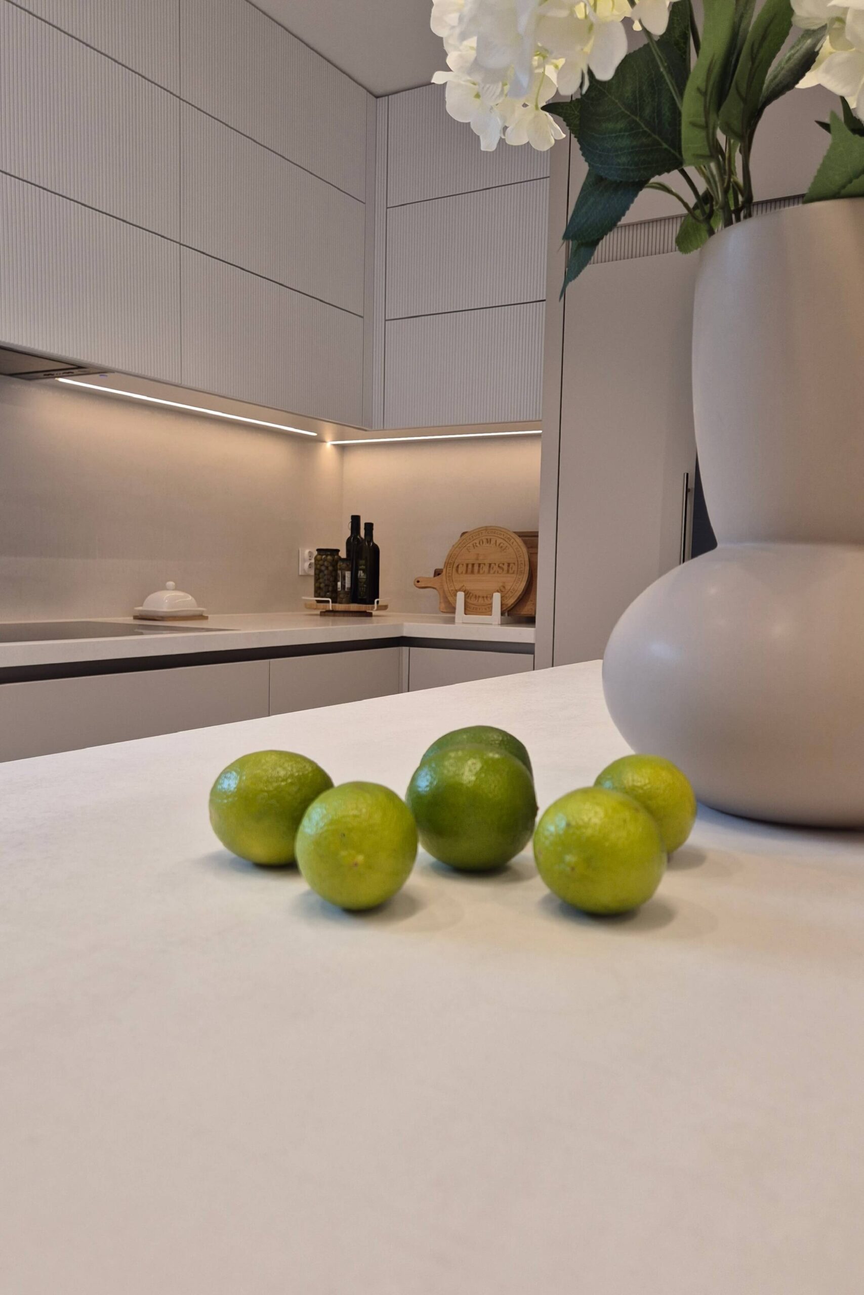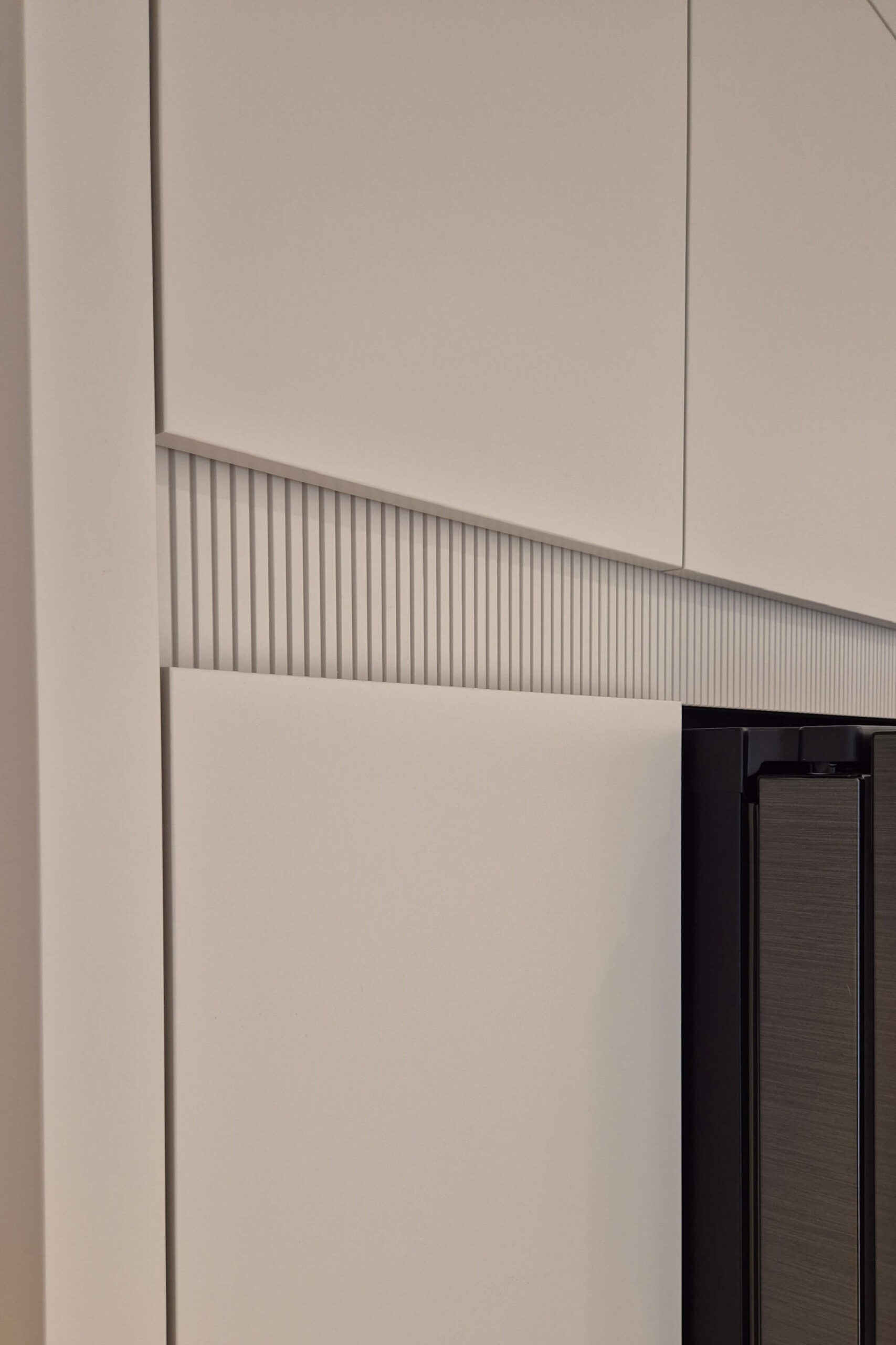 W projekcie zastosowaliśmy fronty lakierowane w matowym odcieniu kaszmir, wzbogacone o ryflowane detale, które nadają wnętrzu wyjątkowego charakteru i subtelnej dynamiki.