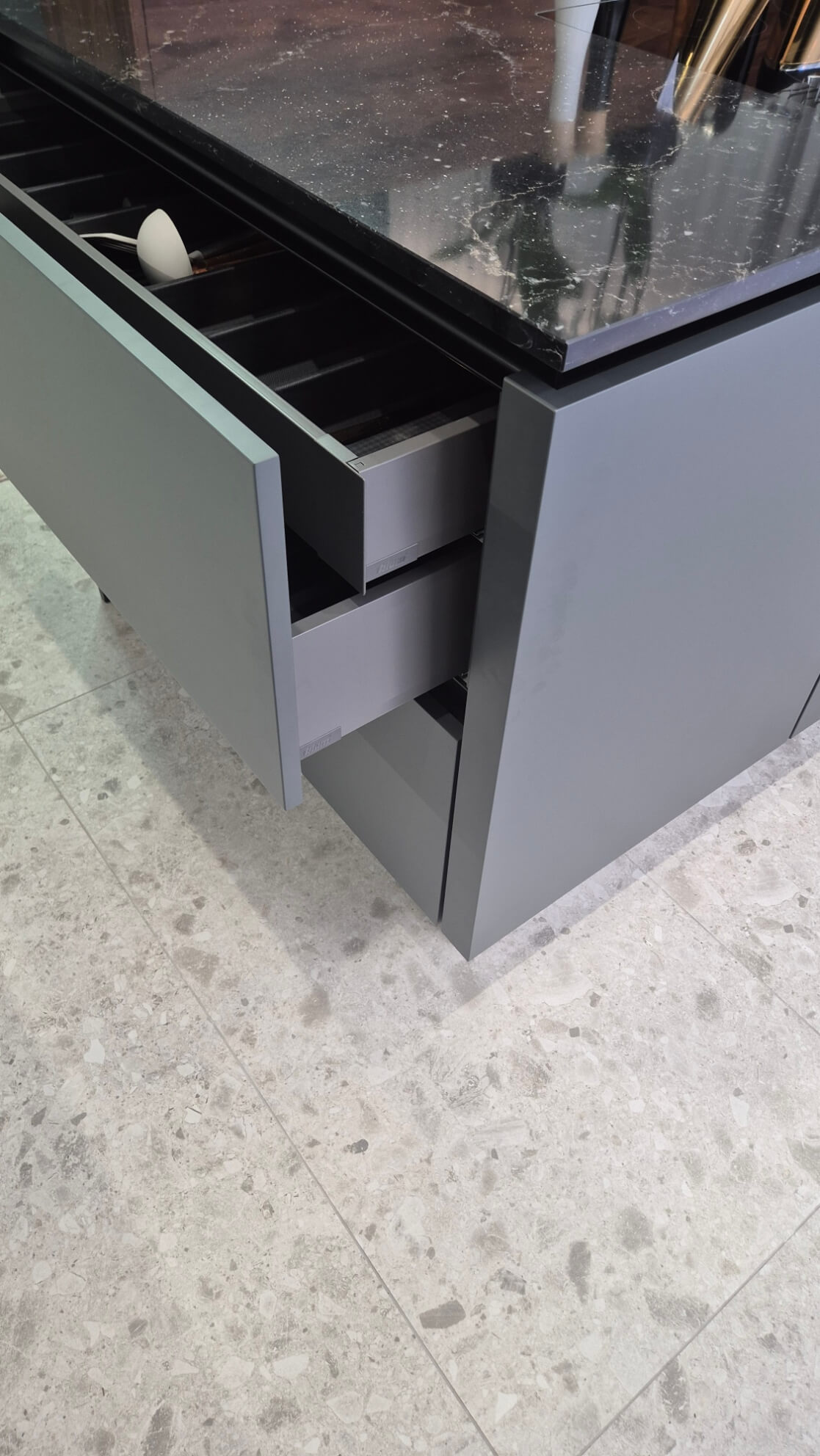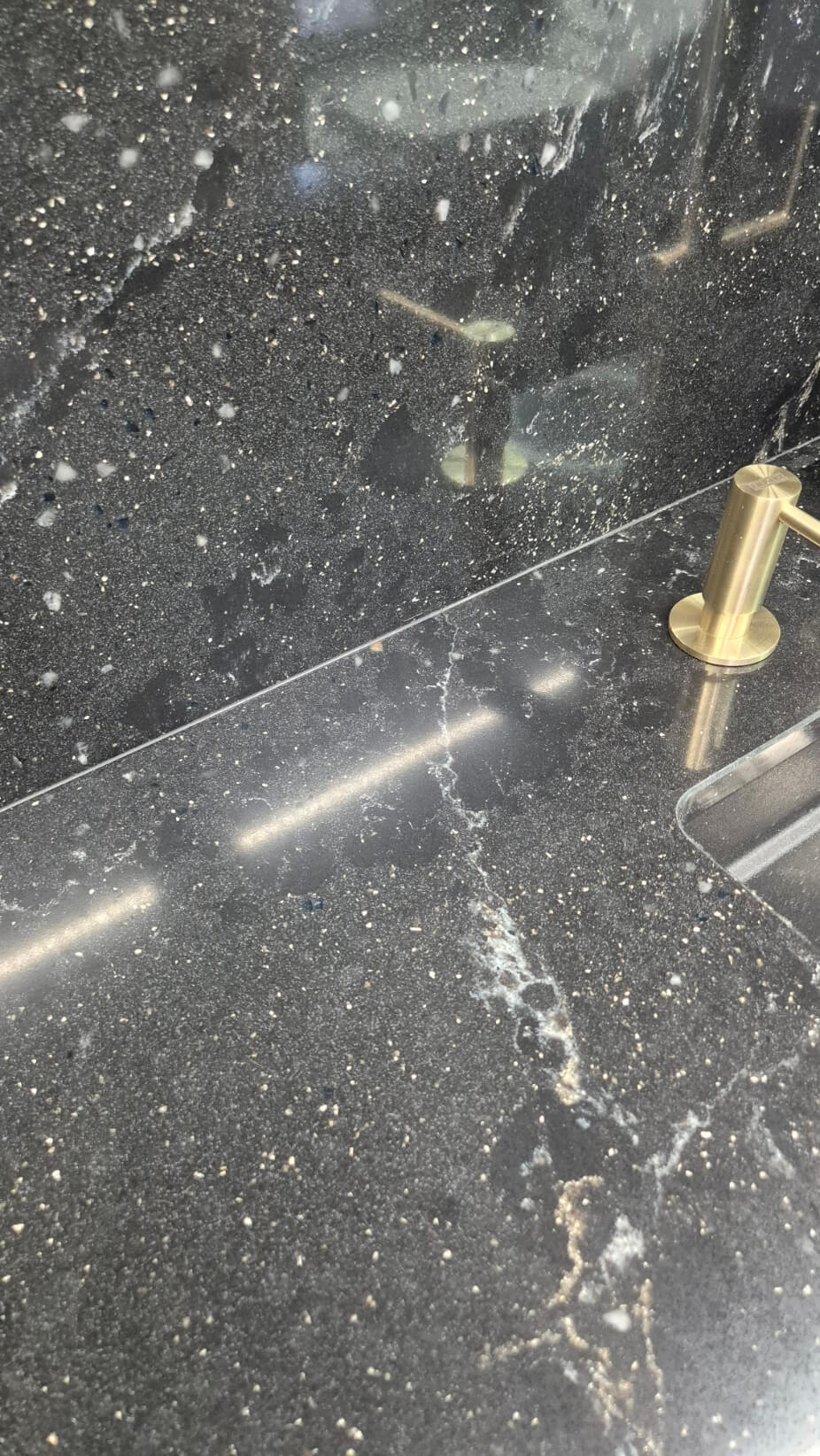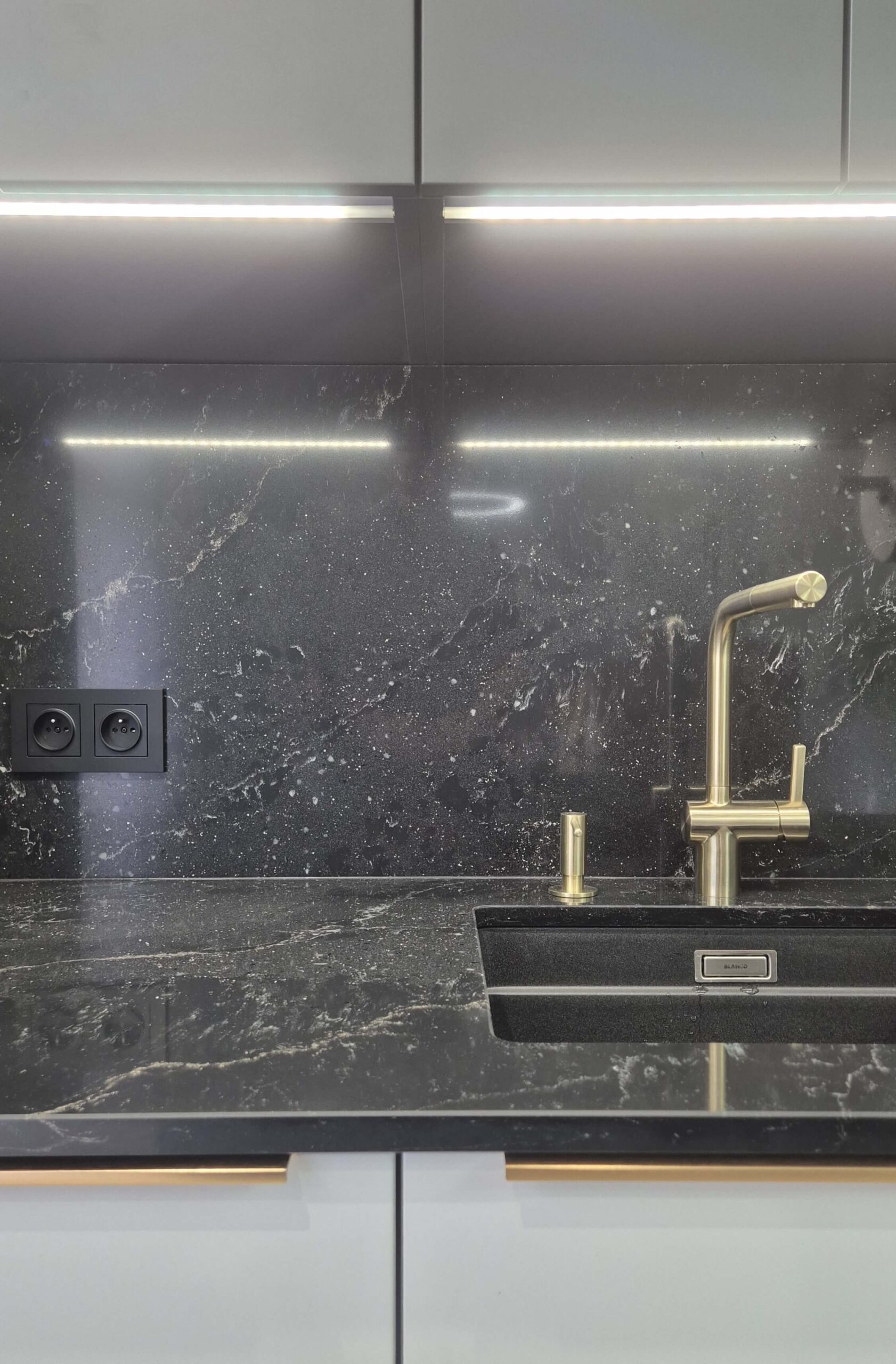 Nie zapomnieliśmy także o detalach, które budują atmosferę tej realizacji. Złote akcenty armatury w połączeniu z ciemnym kamieniem nadają wnętrzu nutę luksusu, a naturalne drewno ociepla całość i sprawia, że kuchnia pozostaje przestrzenią przyjazną i komfortową. To zestawienie materiałów i faktur jest charakterystycznym elementem naszych projektów – zawsze dbamy o balans pomiędzy elegancją a funkcjonalnością.