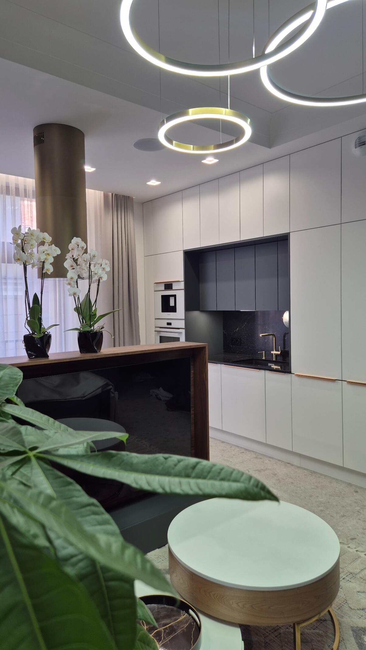 Stworzyliśmy kuchnię na wymiar, w której dominują jasne, gładkie fronty zestawione z ciemnym blatem z konglomeratu kwarcowego Silestone Romantic Ash. To eleganckie połączenie przyciąga uwagę i nadaje wnętrzu prestiżowy charakter, a przy tym zapewnia trwałość i odporność na codzienne użytkowanie.