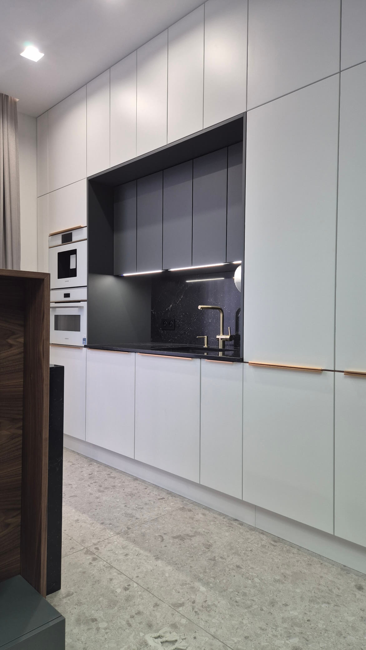 Dzięki starannie przemyślanej zabudowie wszystkie sprzęty AGD zostały wkomponowane w całość, co sprawia, że kuchnia jest spójna i minimalistyczna w formie. Zastosowanie systemów bezuchwytowych sprawia, że fronty tworzą elegancką, jednolitą płaszczyznę, a jednocześnie zapewniają maksymalny komfort korzystania z szafek i szuflad.